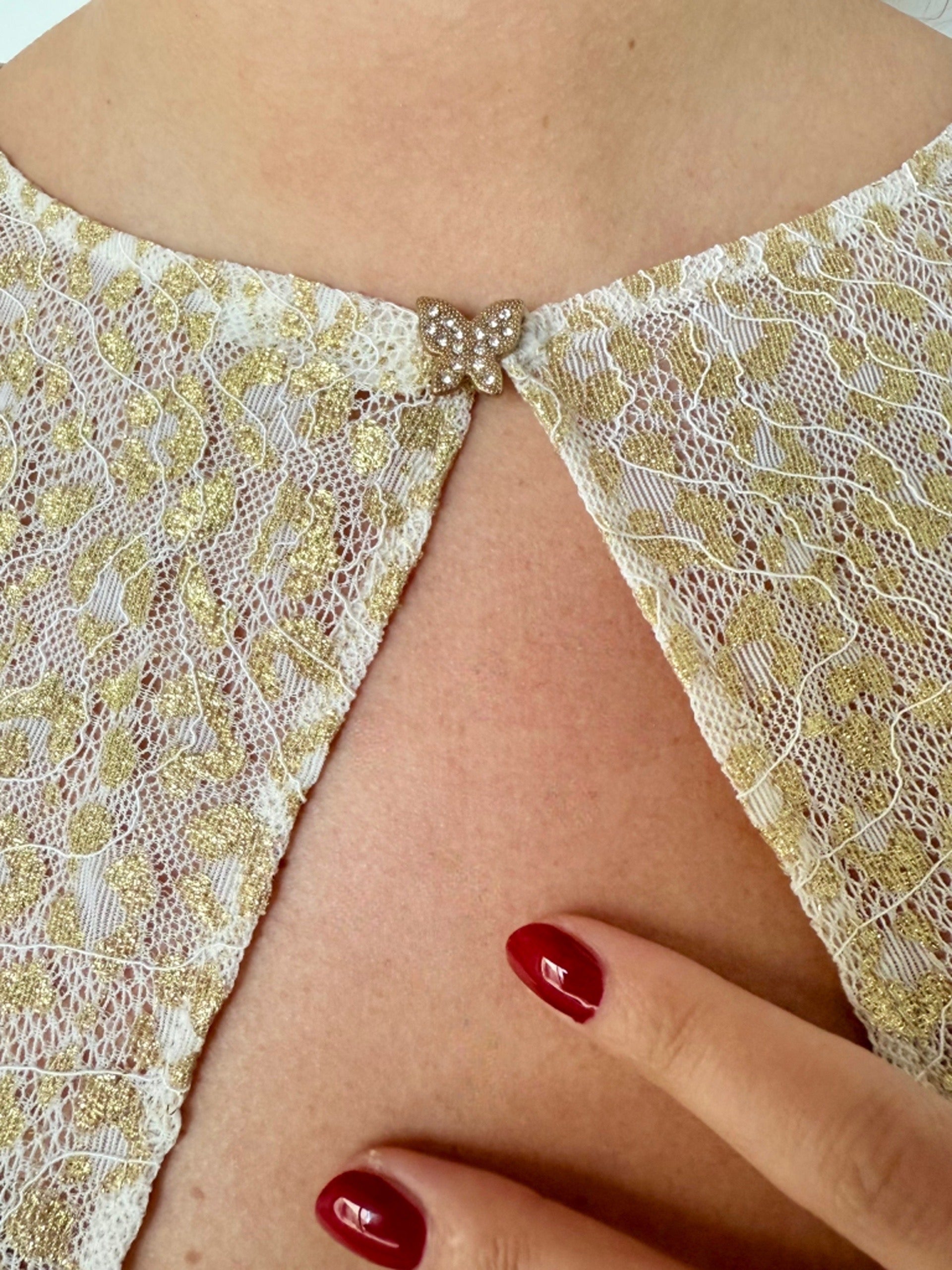 Laissez-vous envoûter par la magie de notre chemisier en dentelle blanche et dorée. Vous pouvez le porter avec le bandeau blanc Lolla ou un maillot de bain pendant vos vacances ! Il se ferme derrière la nuque par un joli bouton papillon.