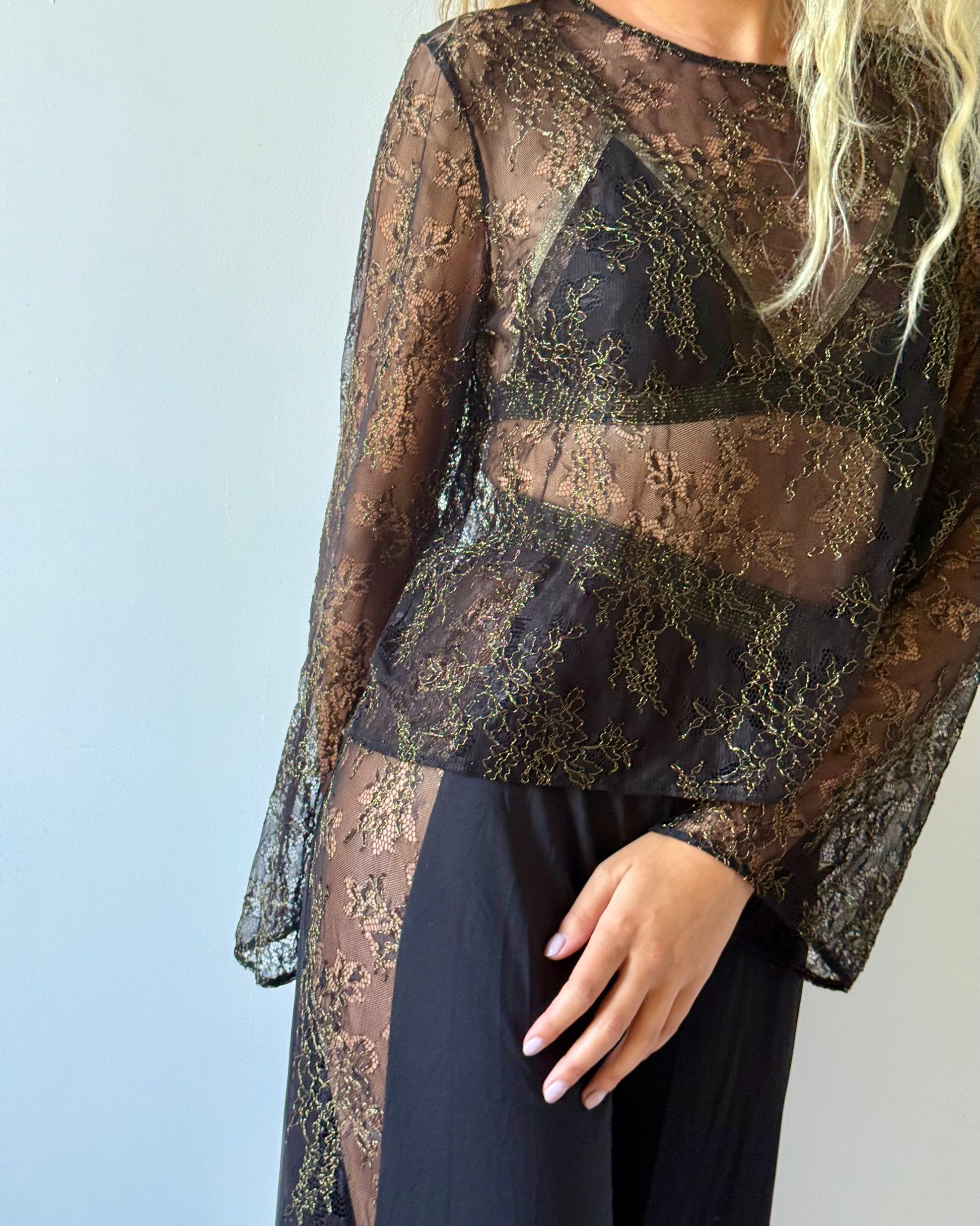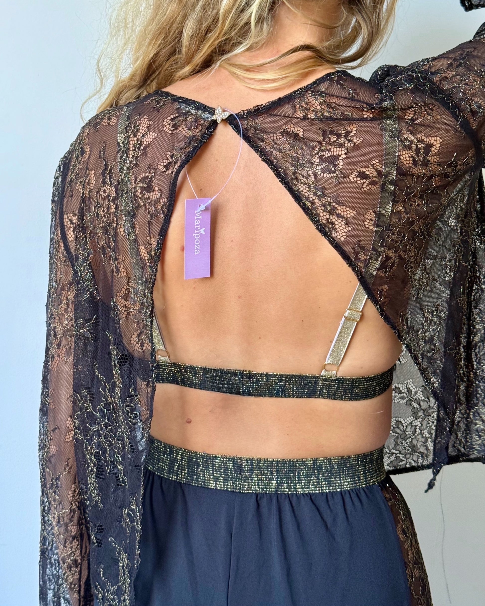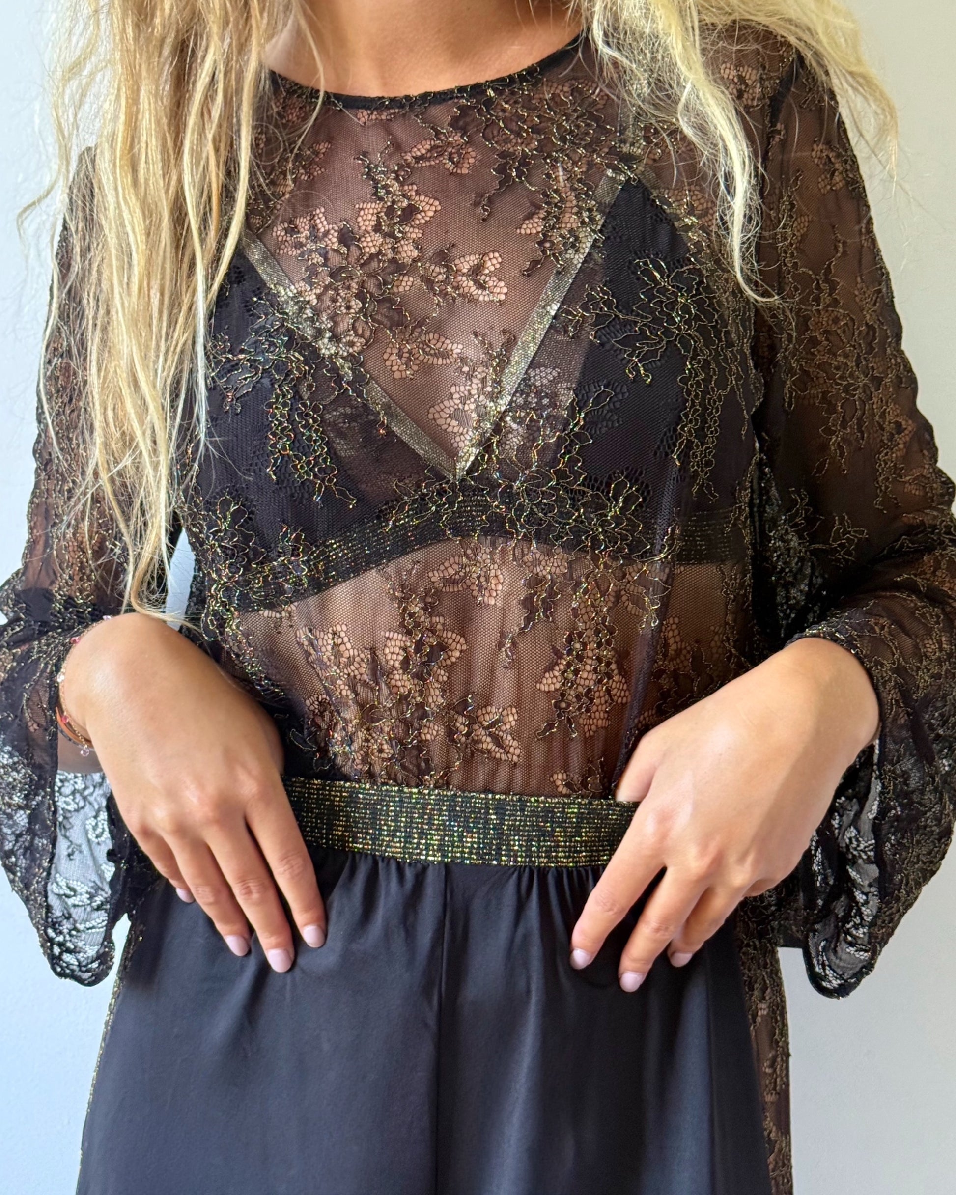 Laissez-vous envoûter par la magie de notre chemisier en dentelle noire et dorée.